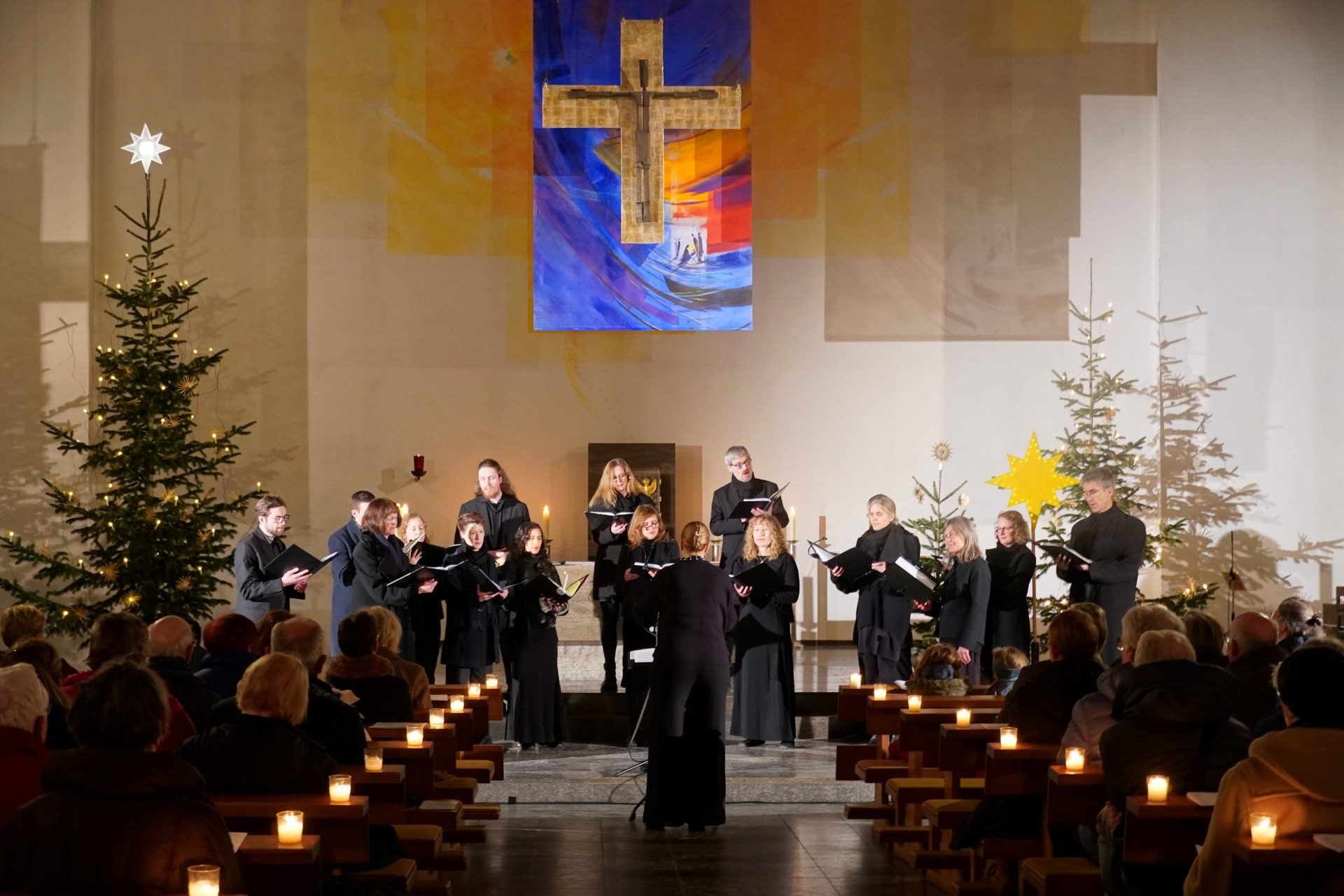Unter dem Motto „Überall soll Freude sein“ wurde das Publikum auf eine musikalische Reise durch die weihnachtliche Klangwelt Europas, passend zum Beginn des Neuen Jahres 2026 entführt. Bei Kerzenschein erklangen stimmungsvolle Chorwerke mit und ohne Orgelbegleitung aus Nord- Süd,- Ost-, und Westeuropa. Sie spiegelten die Vielfalt der europäischen Weihnachtstraditionen in den jeweiligen Muttersprachen wieder und erzählten in jahrhundertealter Tradition aber auch zeitgenössisch vom Licht, vom Neubeginn und der Zuversicht, von den Sternen, der Krippe und der überschäumenden Freude über die Geburt Jesu . Ob aus der Ukraine, Lettland, Katalonien, aus Frankreich, Schweden oder England – die Stücke vermittelten in verspielt und lebendiger Weise ein stets von innerer Wärme getragenes Gegenbild zu winterlicher Dunkelheit und Kälte.