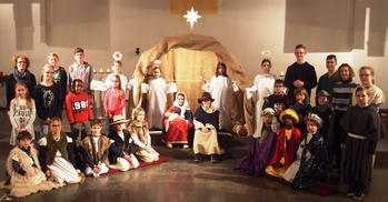 …so hat der Jugendliche Leon Herget das Buch für das diesjährige Krippenspiel überschrieben. Es ist ihm mit den Spielleiterinnen Andrea Herget und Susanne Muß, den jugendlichen Helfern Mattis, Julius und Jakob und den 23 mitspielenden Kindern gelungen vor neu gestalteten Kulissen gelungen, die uralte Botschaft von der Menschwerdung Gottes in Jesus Christus in unsere Zeit zu holen: Eine moderne Familie – mit Navigationsgerät auf der Suche – findet den Weg zum Kind in Betlehem und in Hanau …
