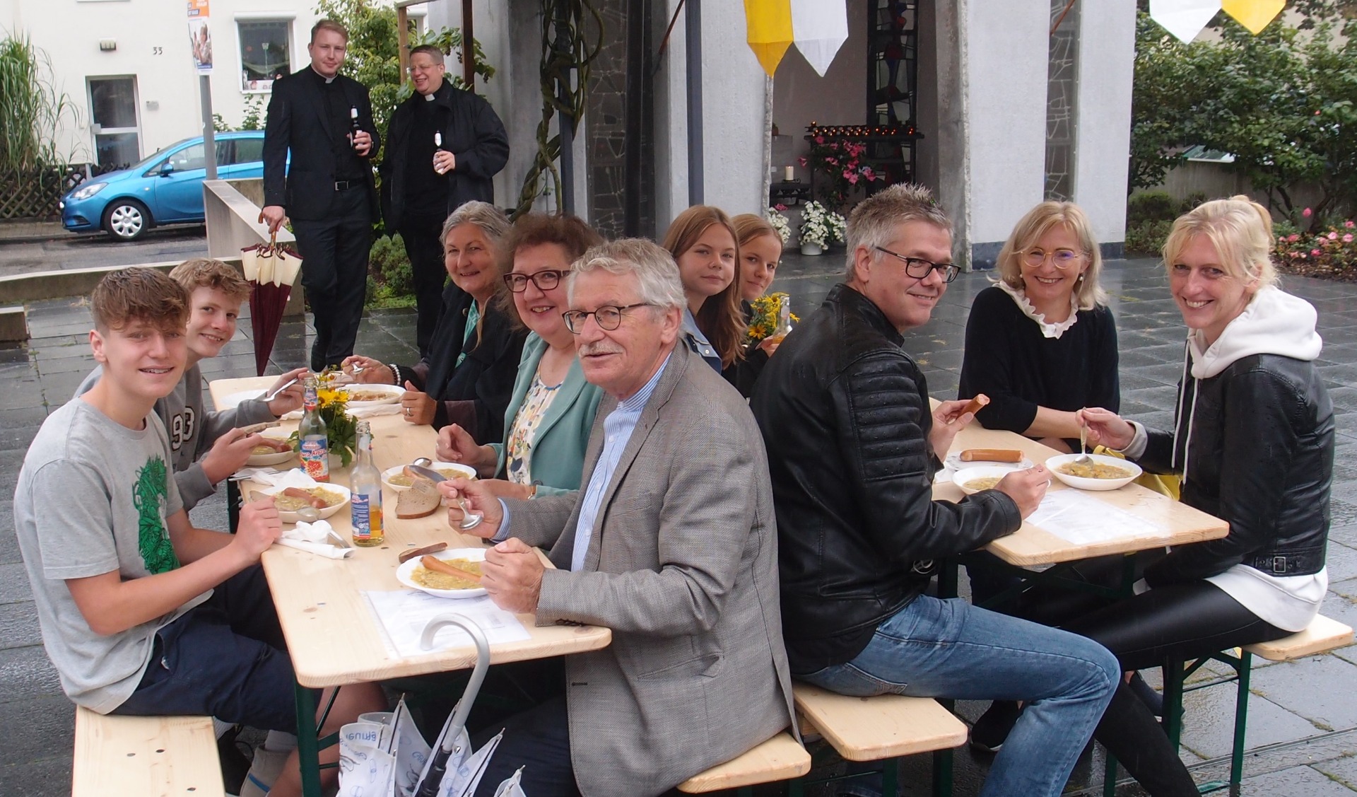 Das diesjährige Fest geht sicher als „das mit dem meisten Regen“ in die Geschichte der Pfarrei ein. Die zahlreichen Gäste blieben unter Schirmen, in der überdachten Weinlaube und im Gemeindehaus zu selbst gekochter Erbsensuppe und selbstgebackenem Kuchen lange zusammen.