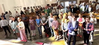 In einem feierlichen Eröffnungsgottesdienst bekamen in der Kesselstädter St. Elisabeth-Pfarrei die Neuen beim Einzelsegen ein Kommunionkreuz und das Glaubensbekenntnis von Gemeindereferentin Margit Lavado und Dechant Andreas Weber überreicht - als Start für die Vorbereitungszeit. An der Osterkerze am Taufstein entzündeten die Kinder ihre Gruppenkerzen. Der Familiengottesdienst wurde von der Elisa-Band musikalisch umrahmt. Im Anschluss trafen sich die Familien noch bei strahlendem Wetter zur Begegnung auf dem Kesselstädter Kirchplatz.