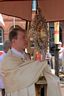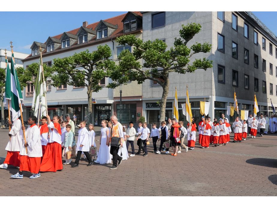 Bei strahlendem Wetter kamen mehrere hundert Gläubige zunächst auf dem Hanauer Marktplatz zu einer festlichen Eucharistiefeier zusammen, um dann mit dem Allerheiligsten in der Monstranz - dem Leib Christ im gewandelten Brot – begleitet von den Priestern, den Ordensschwestern und vielen Messdienern aus allen Kirchorten mit Fahnen, Weihrauch und Schellen in großer Prozession zu vier Stationen in der Innenstadt zu ziehen.