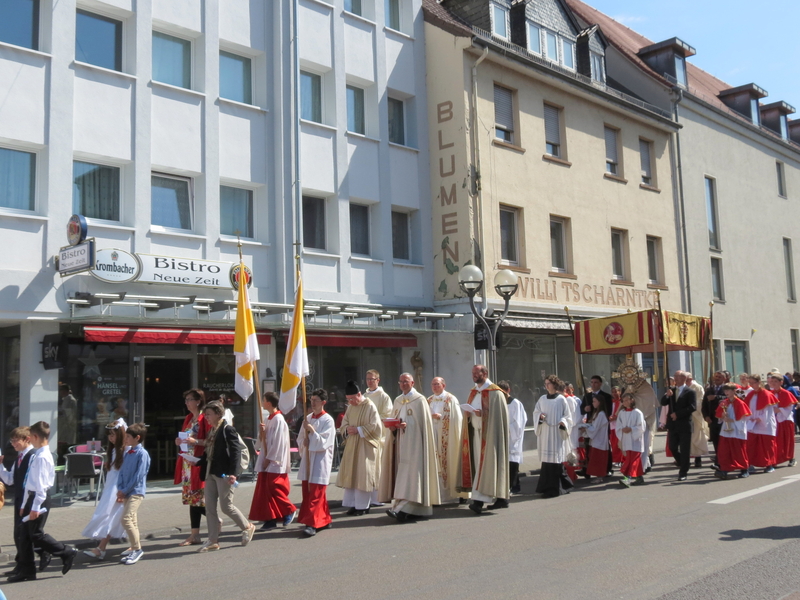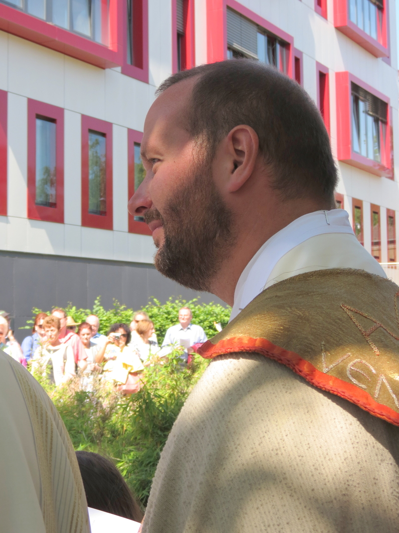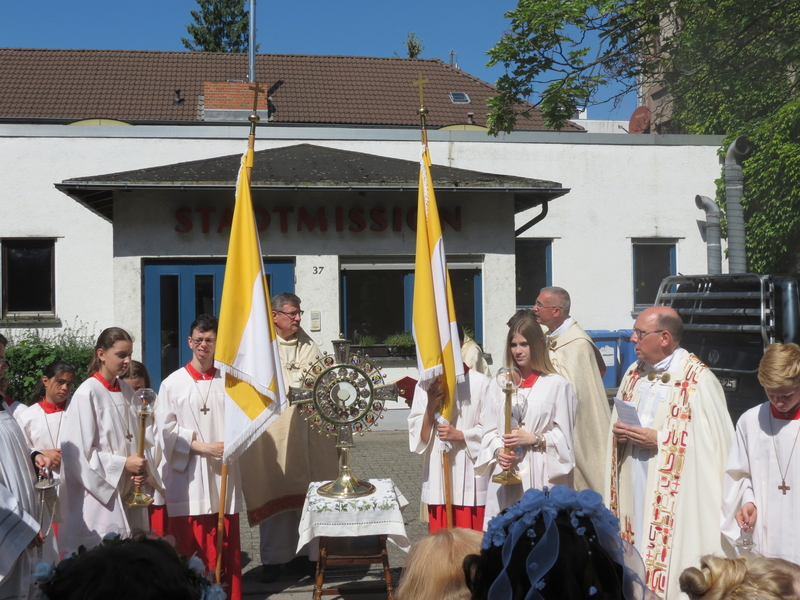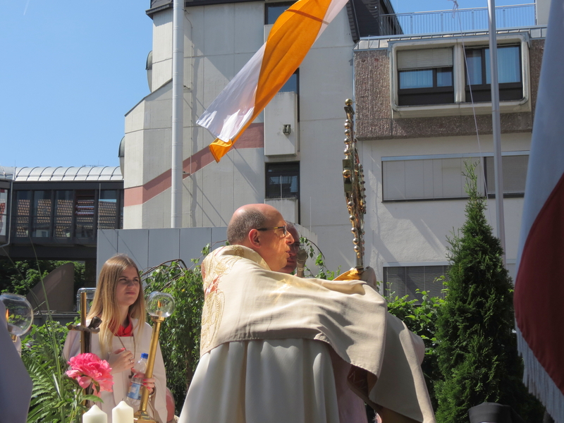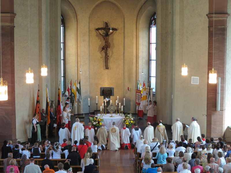 Ein buntes und frohes Glaubensfest feierten die Hanauer Katholiken bei strahlendem Sommerwetter am Fronleichnamstag im Zentrum der Stadt Hanau. Gut eintausend Gläubige - viele auch in ökumenischer Verbundenheit - kamen zur festlichen Eucharistiefeier auf dem Hanauer Marktplatz und zogen dann in einer riesigen farbenfrohen Prozession - durch die Baustellen der Stadt - mit den Hanauer Priestern und vielen Messdienern - mit Fahnen und Weihrauch - betend und singend zur Stadtpfarrkirche Mariae Namen. „Die Kirche ist bunt. Die Kirche ist froh, lebendig und jung. Die Kirche lebt unter den Strahlen der Sonne mitten in unserer wunderbaren Stadt!“, rief Stadtpfarrer Dirk Krenzer in seiner Mut machenden Predigt den Gläubigen zu und erinnerte im freien Gespräch mit den zahlreichen Kindern vor dem Hintergrund der Märchen der Brüder Grimm an den Mittelpunkt des Fronleichnamsfestes „das gute Brot des Lebens“, das der Glaube an Jesus Christus schenkt.