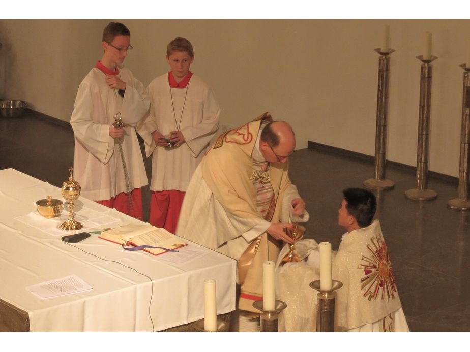 Der Priester mit der Assistenz der Altardiener bei der Fußwaschung am Gründonnerstag: Schon seit vielen Jahren gehört bei uns dieser Ritus fest zur Liturgie des Gründonnerstag. Die Personen wechseln in jedem Jahr und sind bewusst aus allen Altersgruppen, unterschiedlichen Herkunftsländern und je zur Hälfte männlich und weiblich.